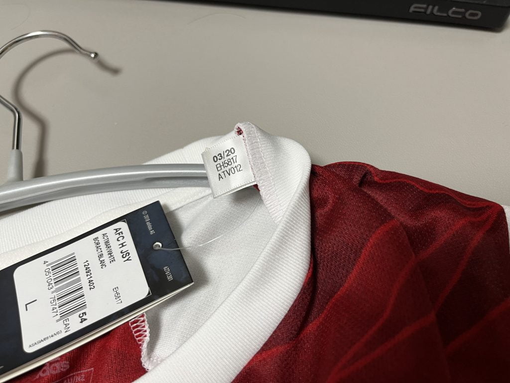 今回購入した20-21シーズンのアーセナルホームユニフォームは「03/20 EH5817 ATV012」です。